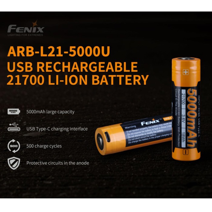 Nabíjacia batéria Fenix 21700 5000 mAh s integrovaným USB-C konektorom prináša maximálne pohodlie pri nabíjaní – priamo z počítača, powerbanky či mobilnej nabíjačky. Vďaka technológii LiNiCoO₂ poskytuje vysokú kapacitu, dlhú životnosť a spoľahlivý výkon aj v extrémnych podmienkach. Batéria je vybavená ochrannou elektronikou, ktorá chráni pred prebitím, vybitím či prehriatím. Ideálna pre svietidlá Fenix PD36R, TK22 UE a ďalšie.